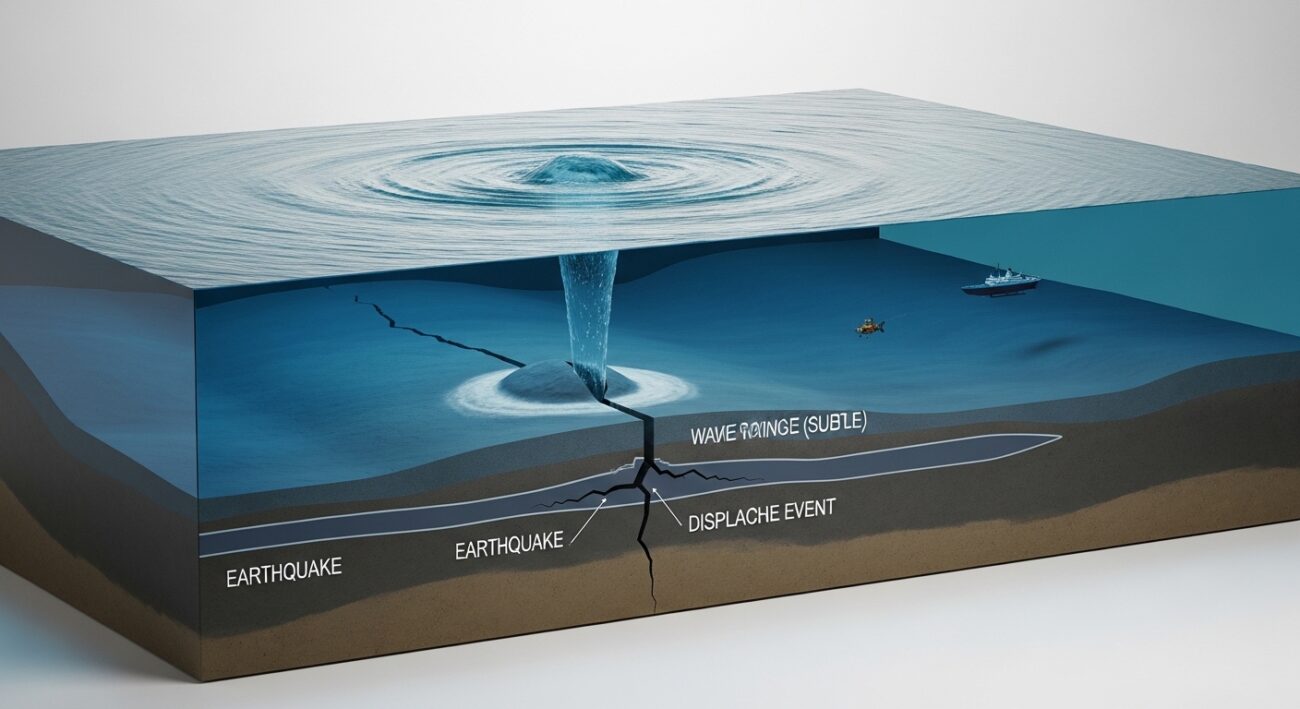 Ponad 80% tsunami jest wywoływanych przez gwałtowne podmorskie trzęsienia ziemi, które powodują pionowe przesunięcia dna oceanicznego, wypychając całą kolumnę wody nad nim.